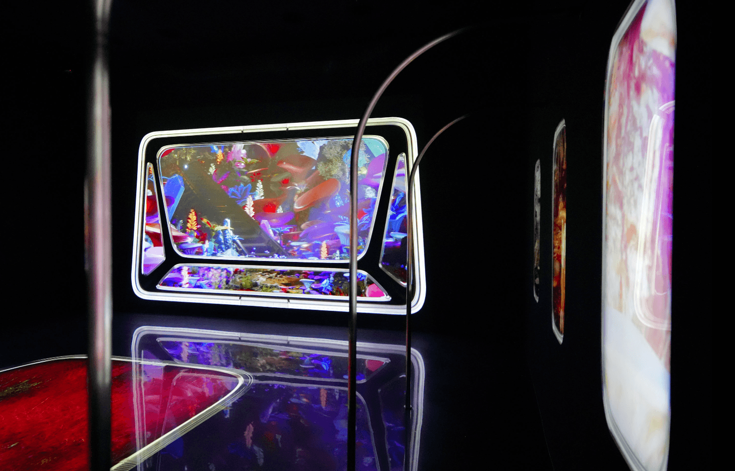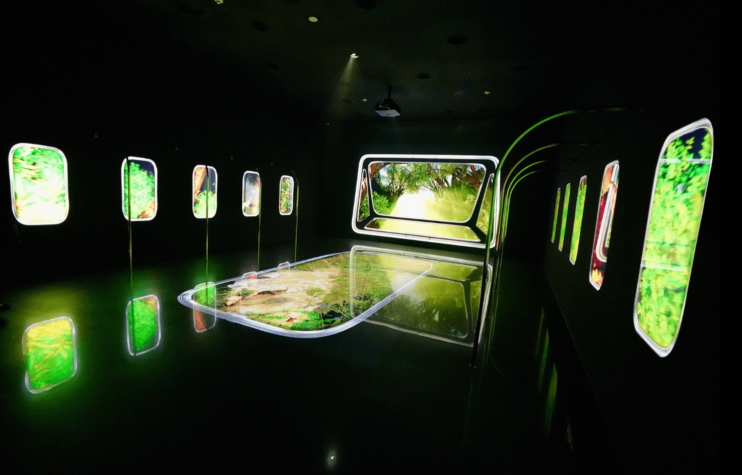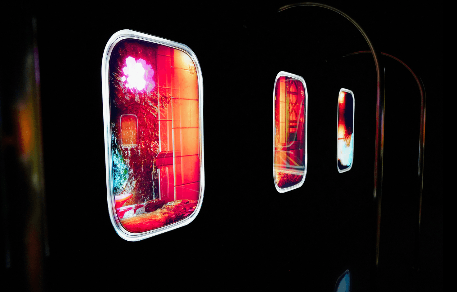 전시장 초입을 실제 기차 내부처럼 연출하기 위해 창문 틀과 열차 손잡이 등의 구조물을 설치, 이를 통해서 낯선 세계로의 첫발을 내디딘다는 감각을 직관적으로 전달했습니다.