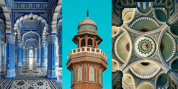 The cylindrical pillars, featuring intricate geometric patterns, move to the rhythm of traditional motifs, inviting you into a mystical scene where the past comes alive.