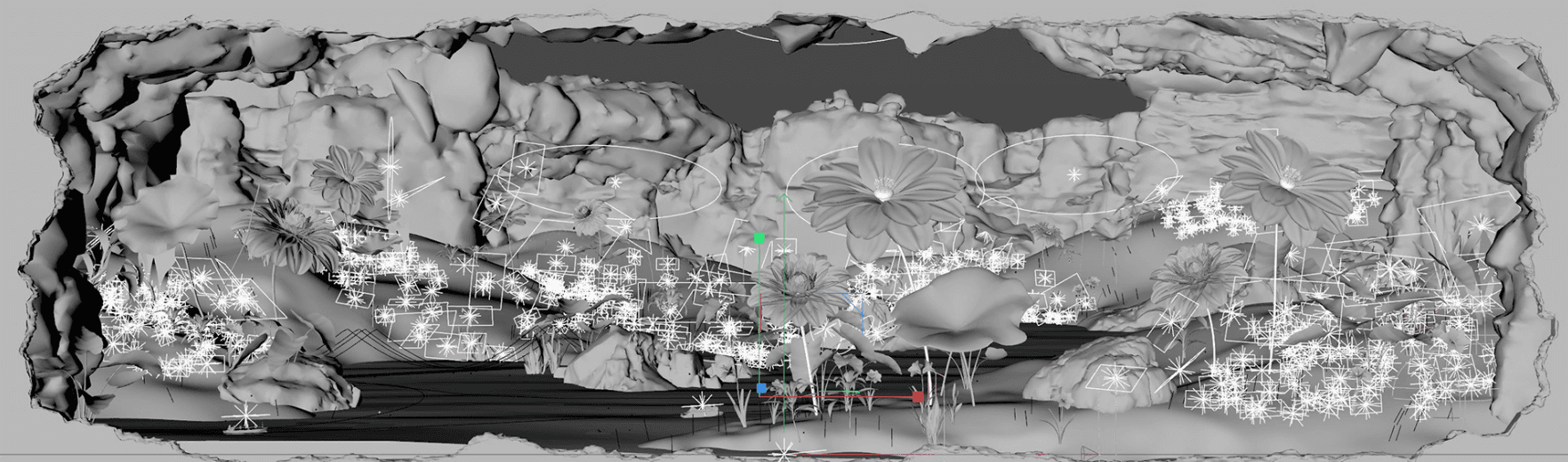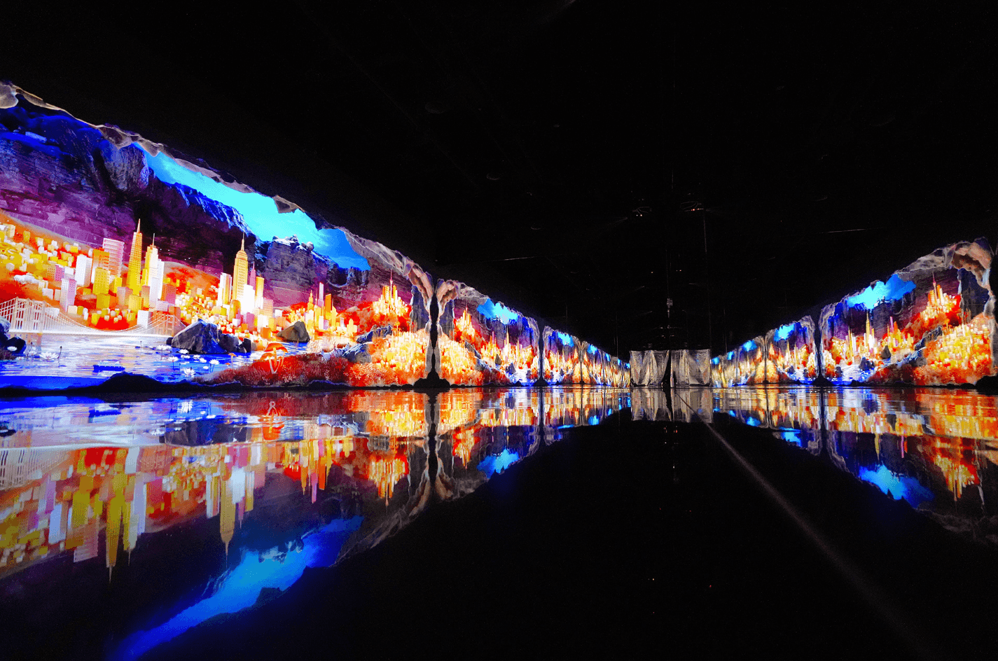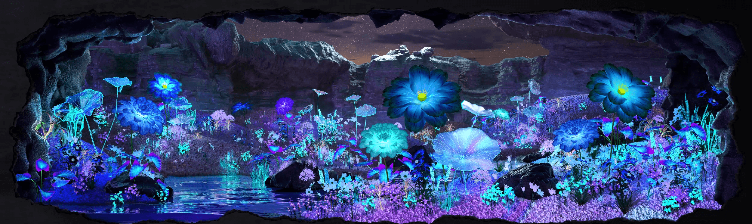 자연 풍경과 상반되는 분위기로 연출 거대한 폭포를 지나 들어온 동굴 속을 초현실적인 신비로운 공간으로 제작